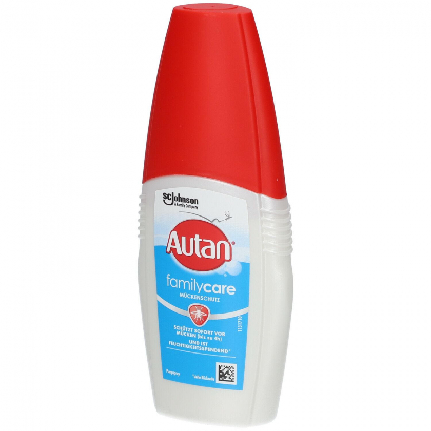 Autan Family Care Pumpspray - репеллент от комаров для всей семьи с увлажняющим эффектом. Обеспечивает до 4 часов защиты, содержит алоэ вера, дерматологически протестирован. Подходит для детей от 2 лет. Форма спрея удобна для нанесения и обеспечивает приятное ощущение на коже.