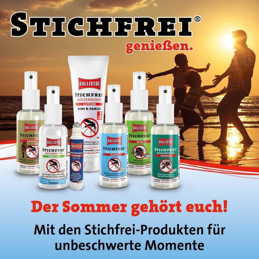Ballistol Stichfrei Classic - эффективное средство защиты от комаров и клещей с икаридином. Обеспечивает до 8 часов защиты, не содержит DEET, подходит для взрослых и детей от 2 лет. Обладает увлажняющим эффектом и приятным цитрусовым ароматом. Можно наносить на кожу и одежду.