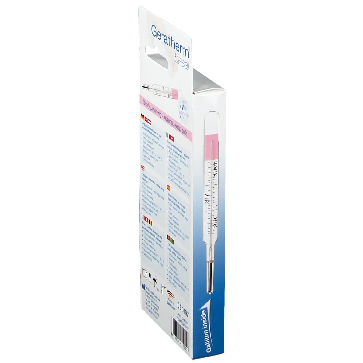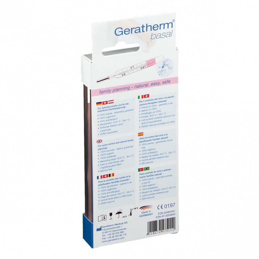 Точный базальный термометр Geratherm® basal с экологичной жидкостью Galinstan для естественного планирования семьи. Позволяет определять овуляцию и фертильные дни путем измерения утренней температуры. Имеет пожизненную гарантию точности ±0,1°C, лупу для чтения, водонепроницаем и гипоаллергенен. В комплекте таблица для записи результатов.