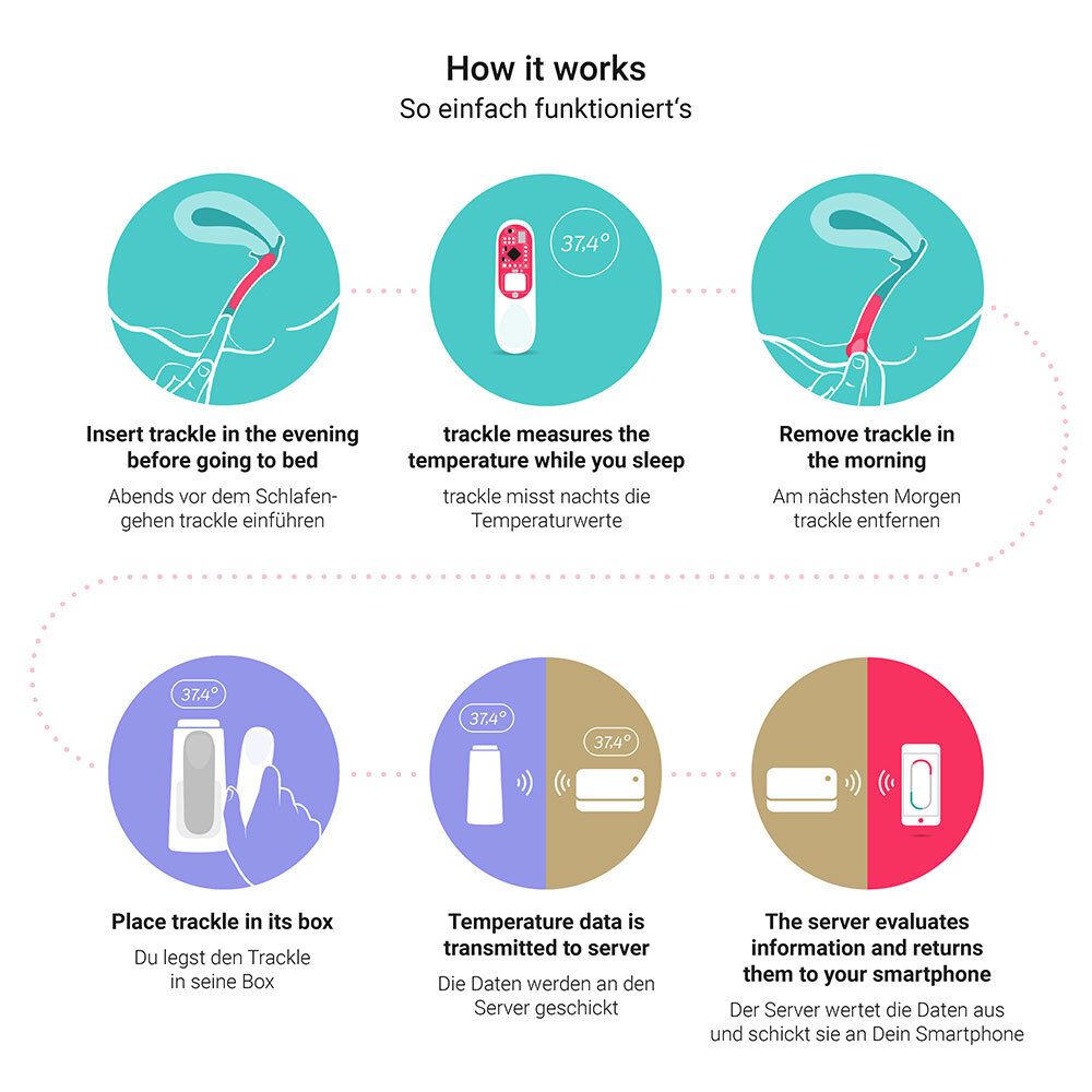 Trackle Zykluscomputer - это медицинское устройство для определения женской фертильности на основе симптотермального метода. Оно измеряет базальную температуру во время сна и синхронизирует данные с мобильным приложением, помогая при гормональной контрацепции, планировании беременности и мониторинге менструального цикла.