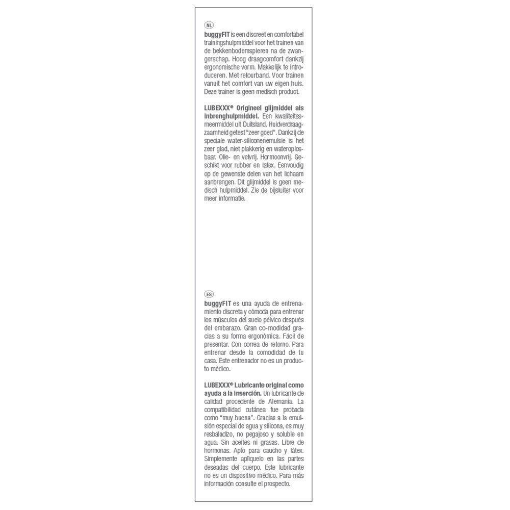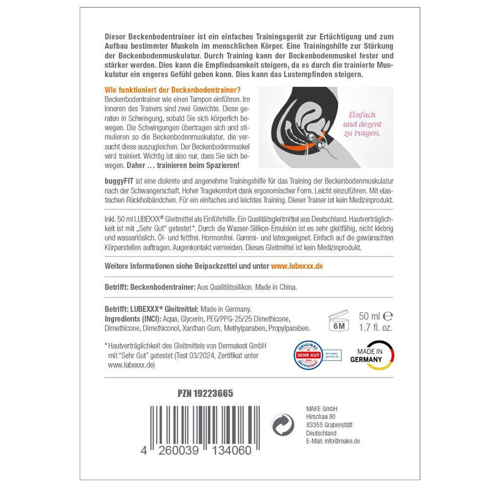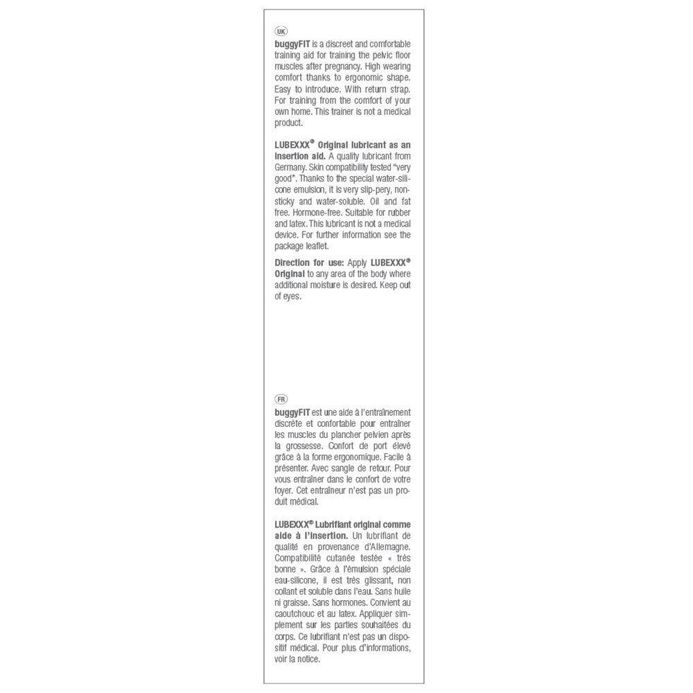 LUBEXXX buggyFIT - набор для тренировки мышц тазового дна после беременности. Включает силиконовый тренажер с весами и гель-смазку для легкого введения. Тренажер стимулирует мышцы при движении, укрепляя тазовое дно, улучшая чувствительность и рекомендуемый гинекологами для восстановления после родов.
