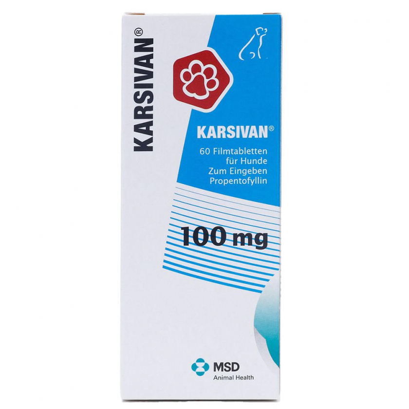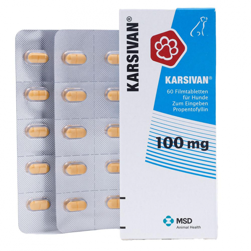 Ветеринарный препарат KARSIVAN® 100 mg Vet для поддержания физической и умственной активности пожилых собак крупных пород. Содержит пропентофиллин, улучшает кровообращение и снабжение кислородом мозга, сердца и мышц, повышает качество жизни стареющих собак. Применяется дважды в день с кормом.