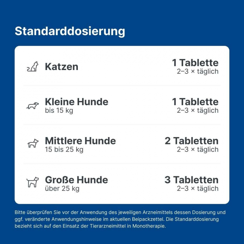 Способ применения: Таблетки принимаются непосредственно или с кормом, дозировка по рекомендации ветеринара