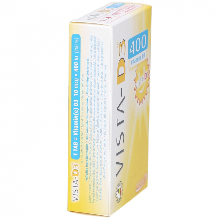 VISTA-D3 400 Junior - детская пищевая добавка с витамином D3 в форме рассасывающихся таблеток со вкусом мяты. Содержит 10 мкг витамина D3 в каждой таблетке, упаковка 120 таблеток. Произведено в Бельгии, предназначено для детей.