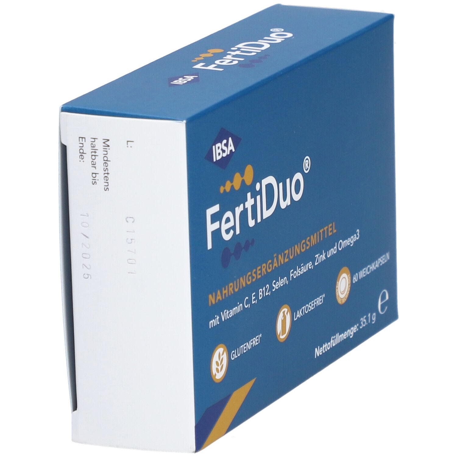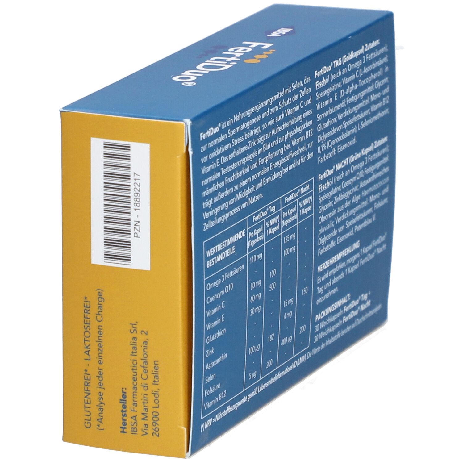 FertiDuo® - пищевая добавка для улучшения параметров спермы у мужчин с проблемами фертильности. Комплекс состоит из двух видов мягких капсул: дневных (золотых) с витаминами C, E, B12, селеном и глутатионом, и ночных (зеленых) с коэнзимом Q10, цинком, фолиевой кислотой и астаксантином. Принимается утром и вечером для поддержки мужского репродуктивного здоровья.