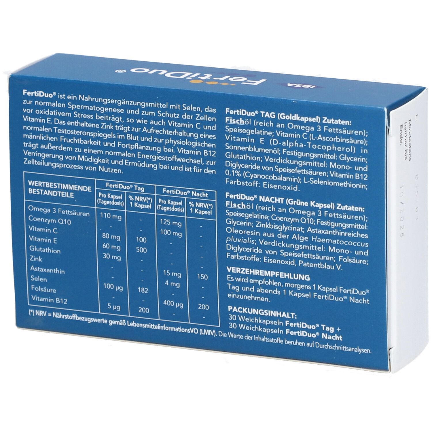 Состав: FertiDuo Tag (золотая капсула): рыбий жир (богатый омега-3 жирными кислотами), пищевой желатин, витамин C (L-аскорбиновая кислота), витамин E (D-альфа-токоферол) в подсолнечном масле, загуститель: глицерин, глутатион, загуститель: моно- и диглицериды пищевых жирных кислот, витамин B12 0,1% (цианокобаламин), L-селенометионин, краситель: оксид железа. FertiDuo Nacht (зеленая капсула): рыбий жир (богатый омега-3 жирными кислотами), пищевой желатин, коэнзим Q10, загуститель: глицерин, бисглицинат цинка, олеорезин, богатый астаксантином из водоросли Haematococcus pluvialis, загуститель: моно- и диглицериды пищевых жирных кислот, фолиевая кислота, красители: оксид железа, патентный синий V