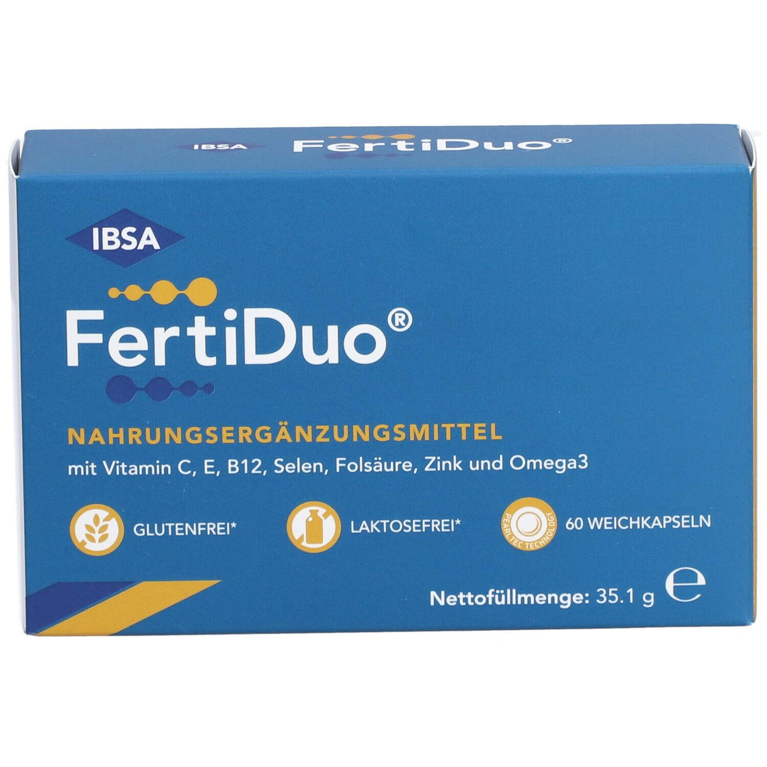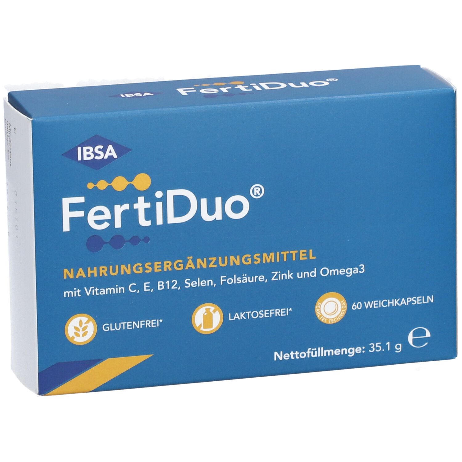 FertiDuo Tag (золотая капсула): рыбий жир (богатый омега-3 жирными кислотами), пищевой желатин, витамин C (L-аскорбиновая кислота), витамин E (D-альфа-токоферол) в подсолнечном масле, загуститель: глицерин, глутатион, загуститель: моно- и диглицериды пищевых жирных кислот, витамин B12 0,1% (цианокобаламин), L-селенометионин, краситель: оксид железа. FertiDuo Nacht (зеленая капсула): рыбий жир (богатый омега-3 жирными кислотами), пищевой желатин, коэнзим Q10, загуститель: глицерин, бисглицинат цинка, олеорезин, богатый астаксантином из водоросли Haematococcus pluvialis, загуститель: моно- и диглицериды пищевых жирных кислот, фолиевая кислота, красители: оксид железа, патентный синий V