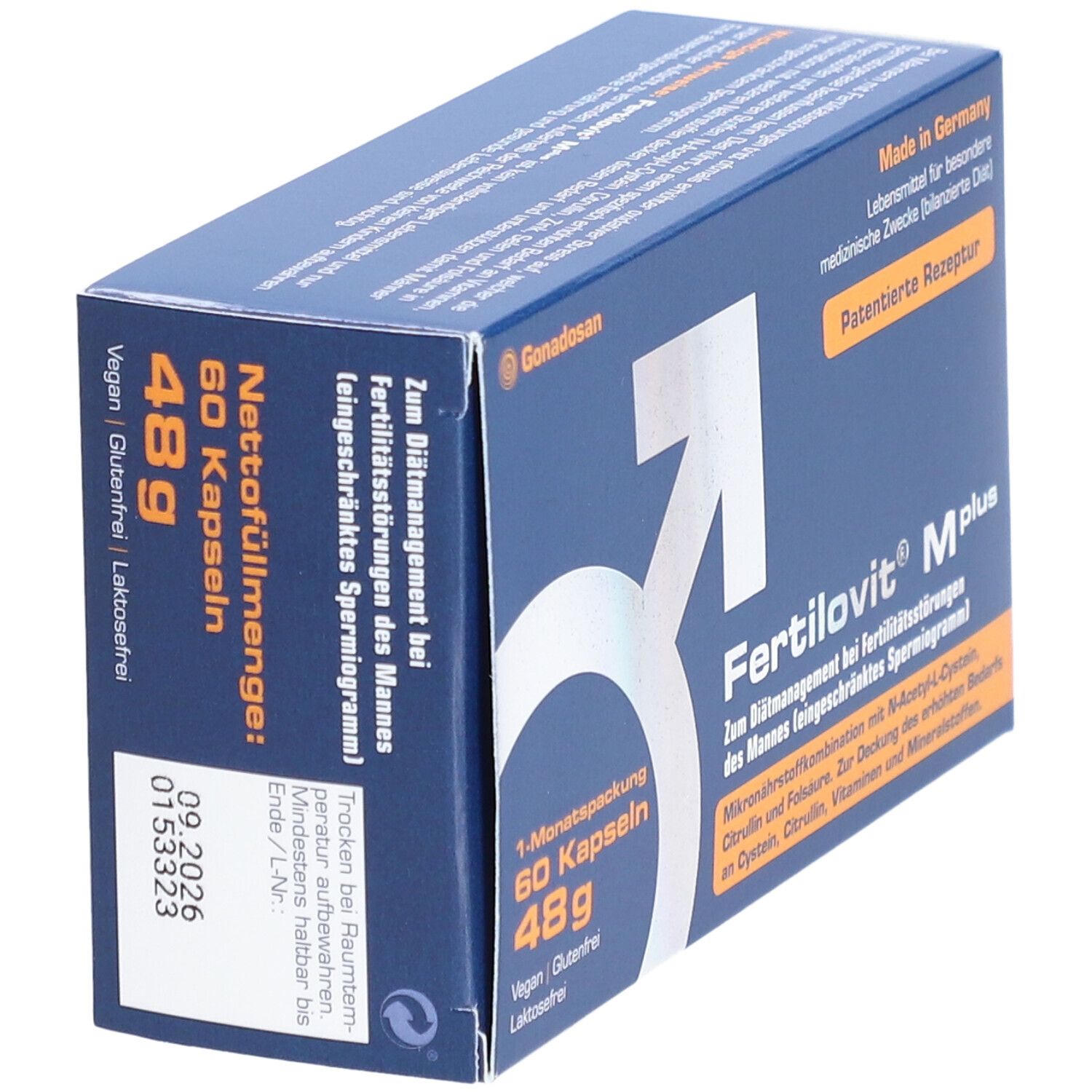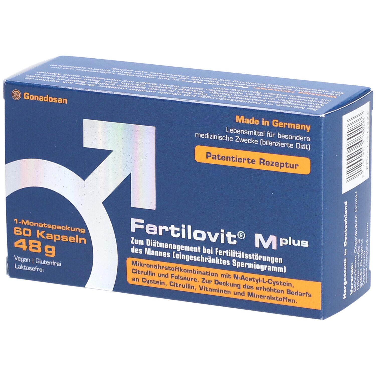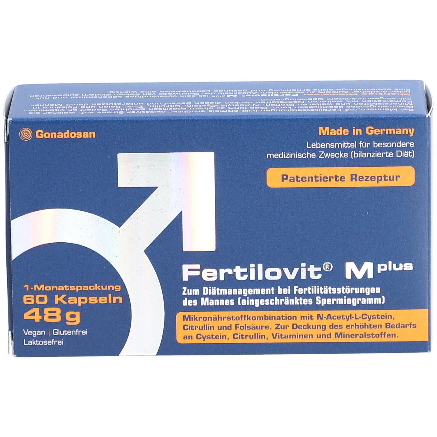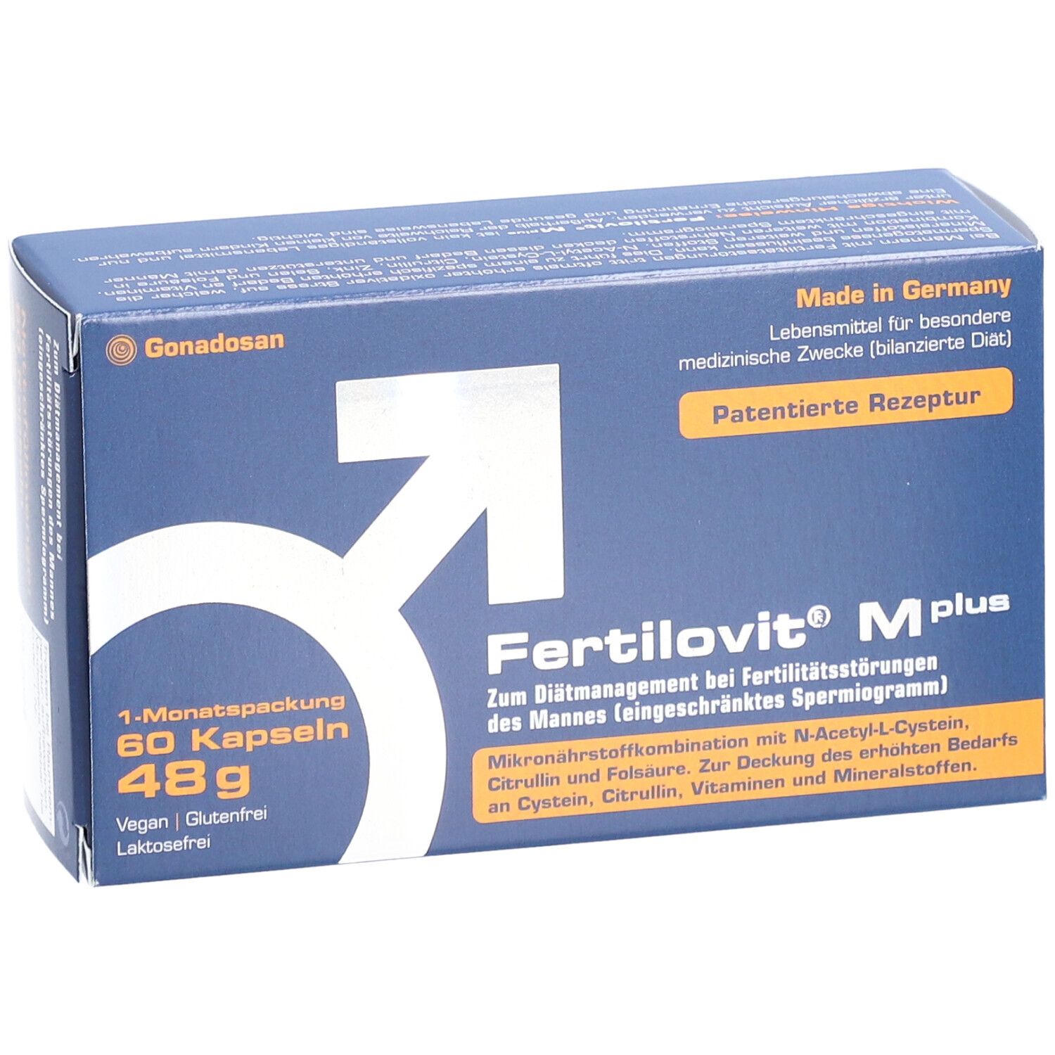 Fertilovit® M plus - диетическое средство для специальных медицинских целей, предназначенное для лечения нарушений фертильности у мужчин с ограниченной спермограммой. Содержит комплекс витаминов, антиоксидантов и микроэлементов для улучшения качества спермы и поддержания мужской репродуктивной функции.