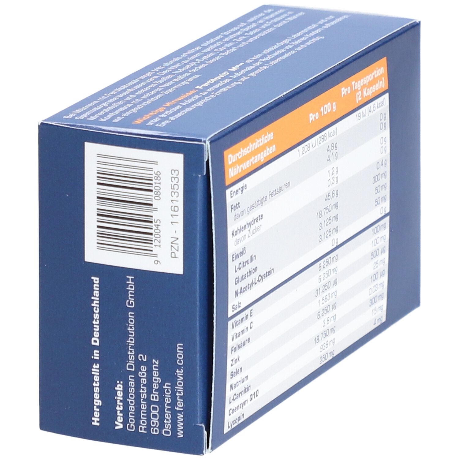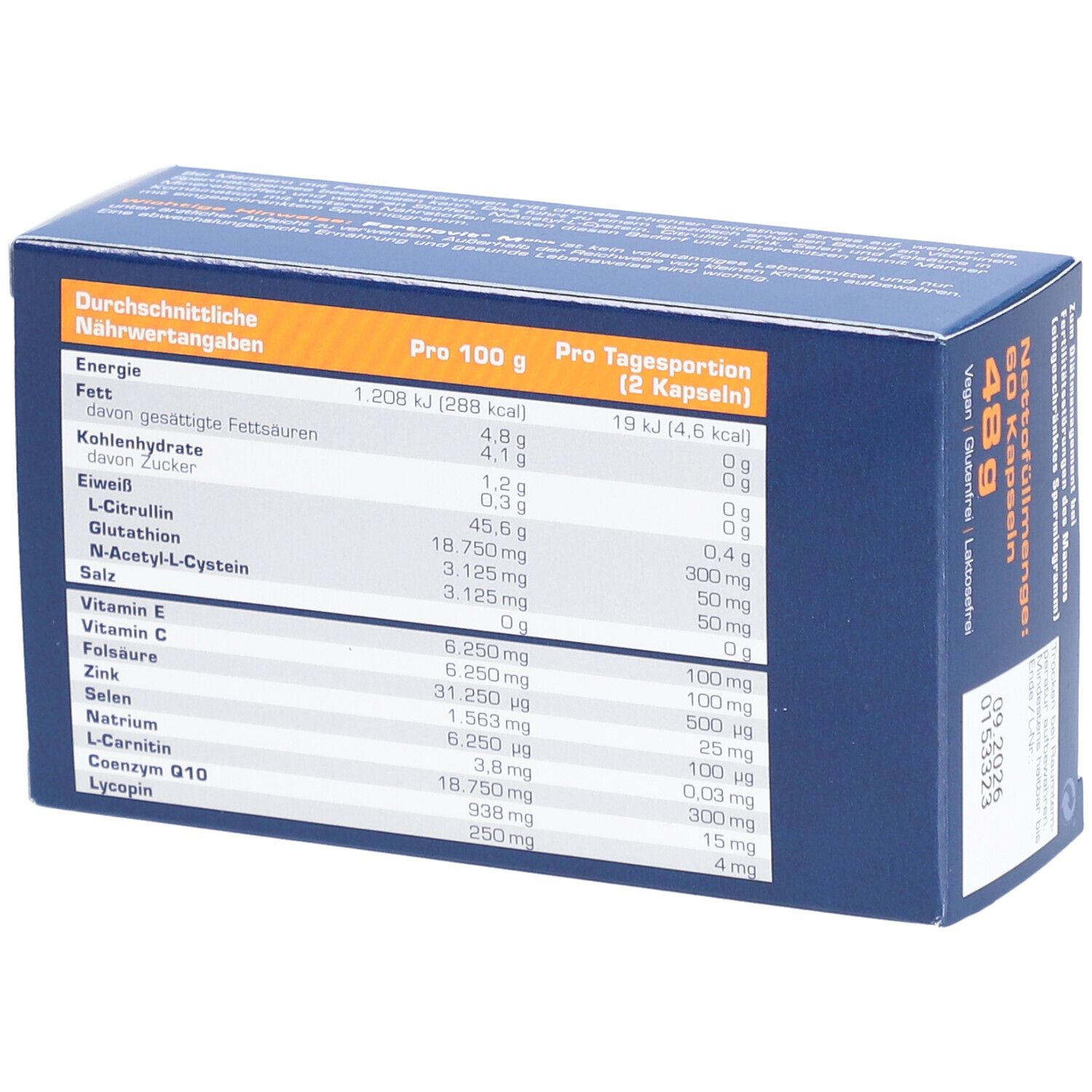 Состав: Витамин C (100 мг), витамин E (100 мг), фолиевая кислота (500 мкг), селен (100 мкг), цинк (25 мг), глутатион (50 мг), N-ацетил-L-цистеин (50 мг), L-карнитин (300 мг), L-цитруллин (300 мг), коэнзим Q10 (15 мг), ликопин (4 мг), убидекаренон (7,5 мг), ликопин (2 мг), фолиевая кислота (0,25 мг), натрия селенит, общий белок (200 мг), левокарнитин, аскорбиновая кислота, оксид цинка, DL-α-токоферола гидрогенсукцинат, вспомогательные вещества: гипромеллоза, этилцеллюлоза, концентрат моркови