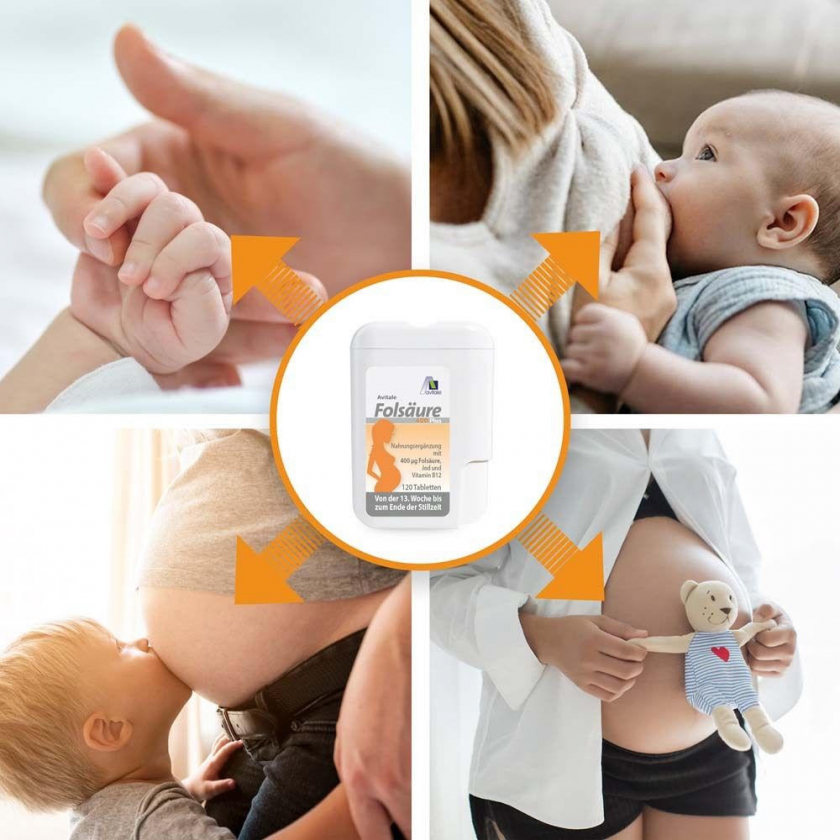 Avitale Folsäure 400 Plus - пищевая добавка с фолиевой кислотой, йодом и витамином B12, специально разработанная для женщин с 13-й недели беременности до конца периода грудного вскармливания. Содержит оптимальную дозировку необходимых нутриентов для поддержания здоровья матери и ребенка.