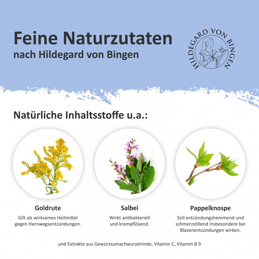 Растительная добавка Dignatio! Blasenkraft содержит комбинацию экстрактов золотарника, почек тополя, шалфея и коры сумаха пряного с витаминами C и B9. Поддерживает нормальный отток мочи и здоровье мочевыделительной системы. Продукт основан на традиционных растительных рецептах из монастырских садов.