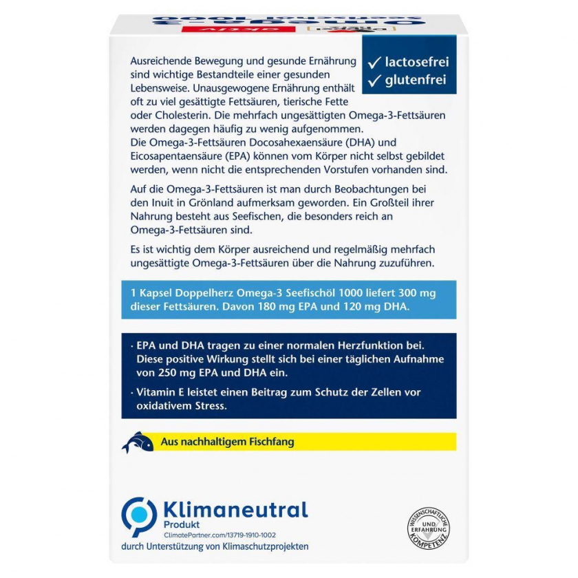 Пищевая добавка Doppelherz Omega-3 Seefischöl 1000 с высоким содержанием омега-3 жирных кислот (EPA и DHA) для поддержания нормальной функции сердца. Каждая капсула содержит 1000 мг рыбьего жира, 300 мг омега-3 кислот и витамин E. Рекомендуется принимать по 1 капсуле в день для восполнения дефицита омега-3 в рационе.