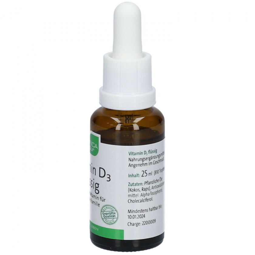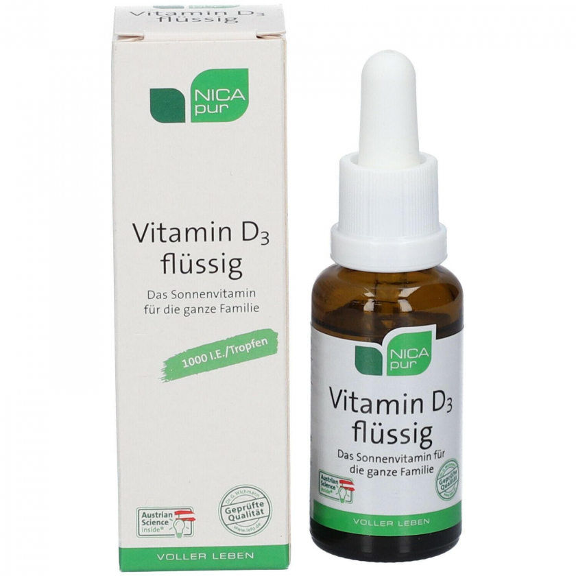 Жидкий витамин D3 NICA pur - высококачественная добавка для всей семьи. Содержит 1000 МЕ витамина D3 в одной капле на основе растительных масел. Поддерживает иммунную систему, здоровье костей и мышц. Без фруктозы, глютена и лактозы. Удобная жидкая форма для легкого дозирования.