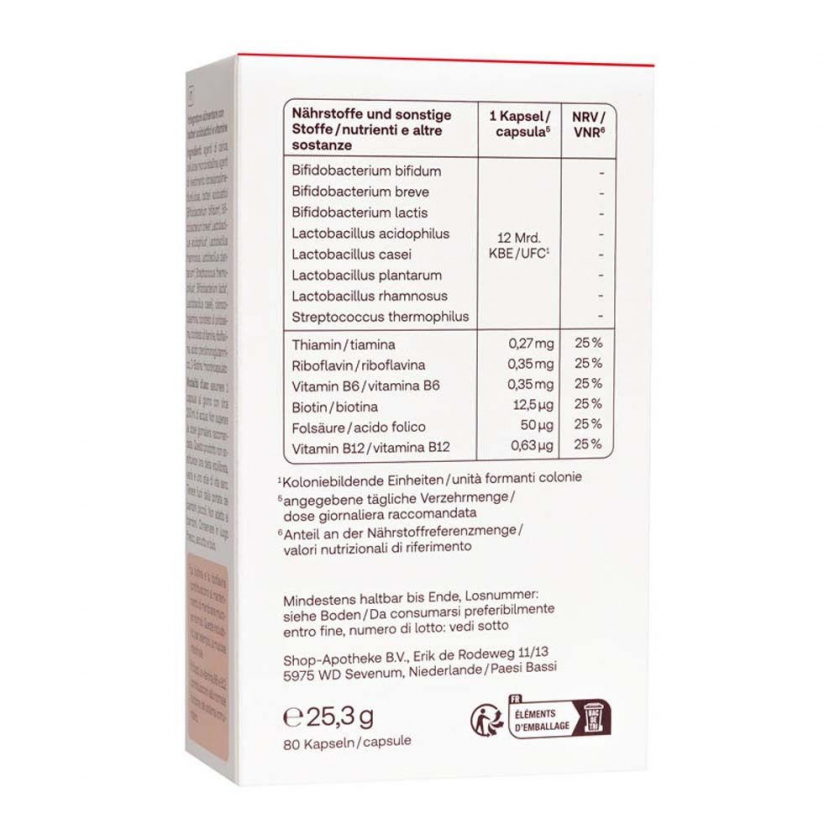 Состав: Филлматериал: Микрокристаллическая целлюлоза, оболочка: Гидроксипропилметилцеллюлоза, молочнокислые бактерии (Bifidobacterium bifidum1, Bifidobacterium breve1, Lactobacillus acidophilus1, Lactobacillus rhamnosus, Lactobacillus plantarum1, Streptococcus thermophilus1, Bifidobacterium lactis1, Lactobacillus casei), цианокобаламин, пиридоксин гидрохлорид, тиамин гидрохлорид, рибофлавин, фолиевая кислота, D-биотин – частично микрокапсулированные бактерии.