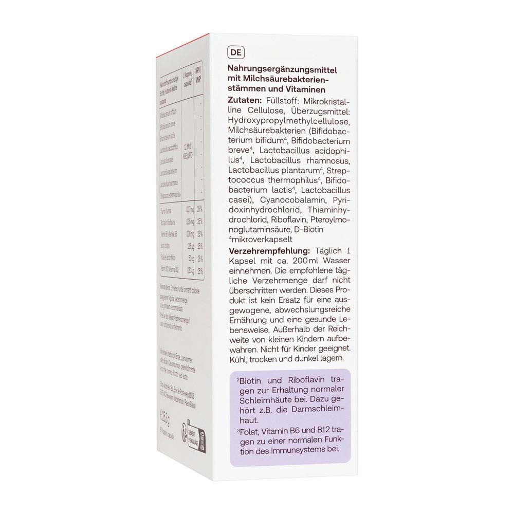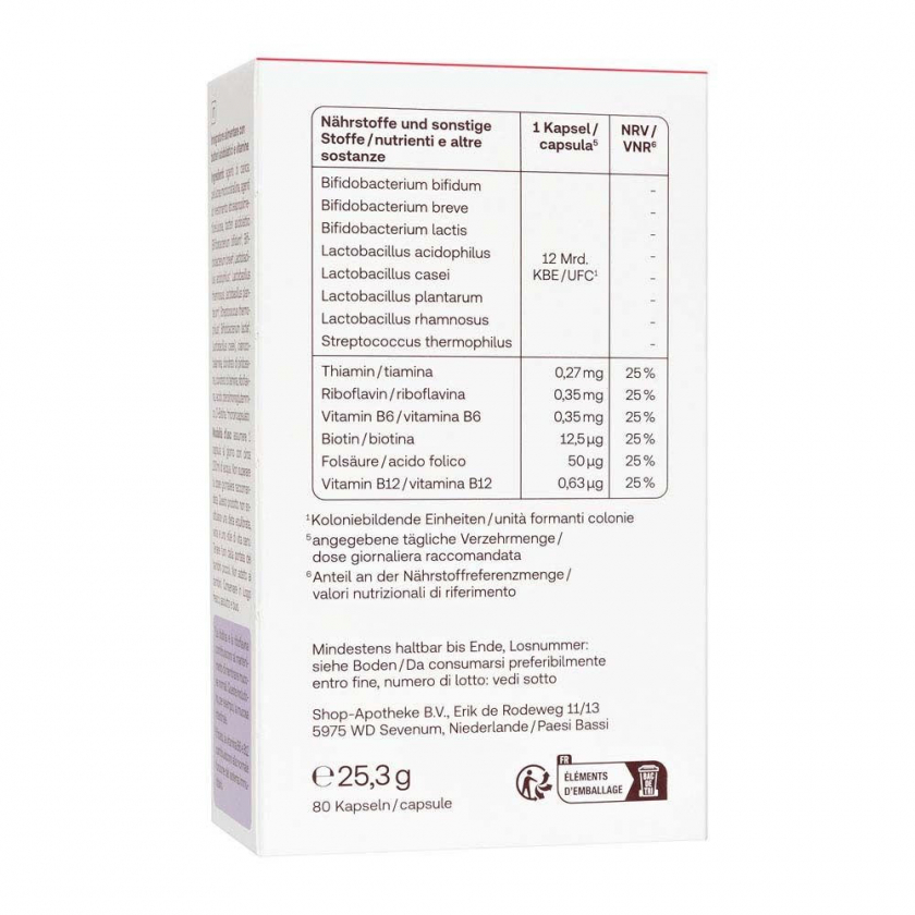 Состав: Наполнитель: микрокристаллическая целлюлоза, покрытие: гидроксипропилметилцеллюлоза, молочнокислые бактерии (Bifidobacterium bifidum, Bifidobacterium breve, Lactobacillus acidophilus, Lactobacillus rhamnosus, Lactobacillus plantarum, Streptococcus thermophilus, Bifidobacterium lactis, Lactobacillus casei), цианокобаламин, гидрохлорид пиридоксина, гидрохлорид тиамина, рибофлавин, птероилмоноглутаминовая кислота, D-биотин