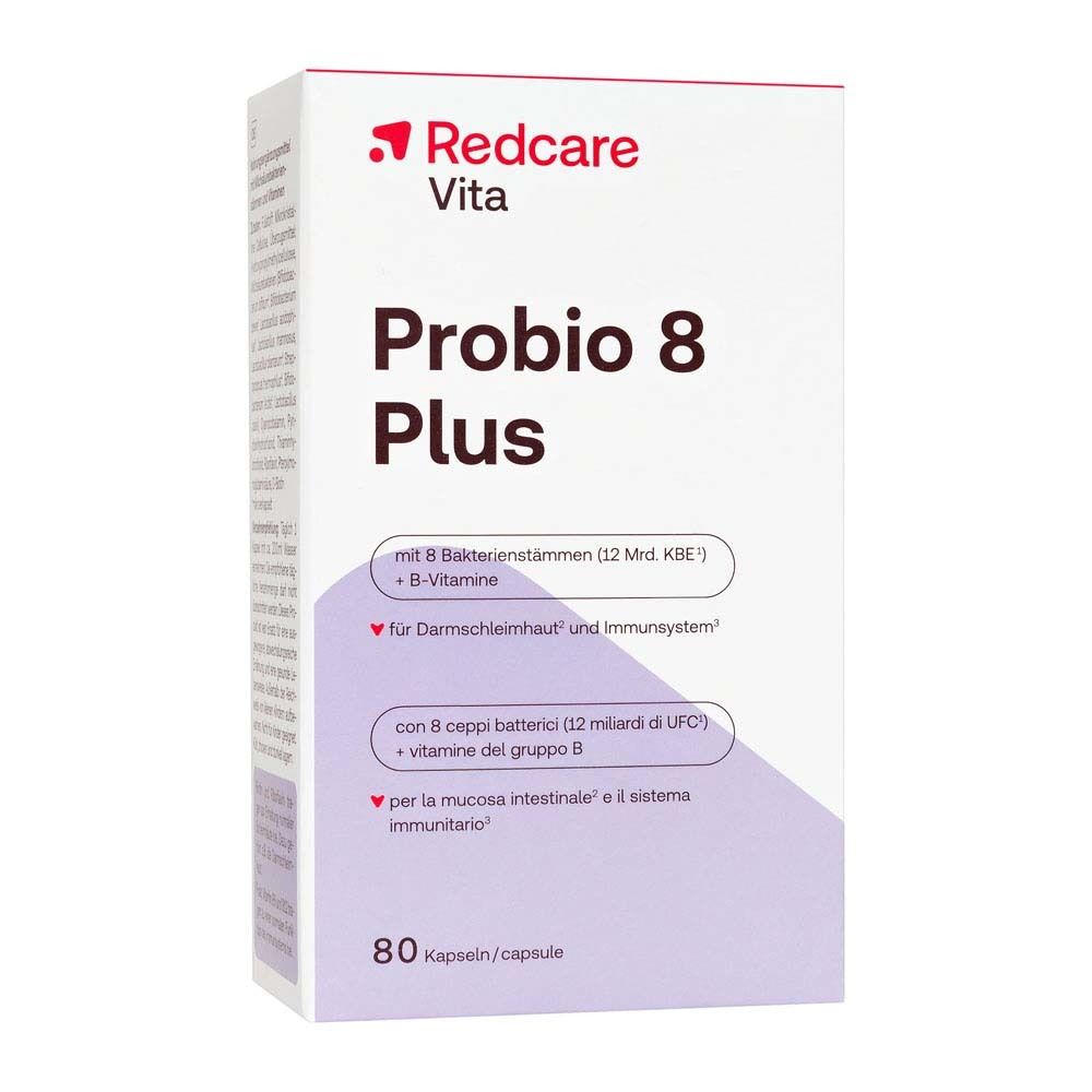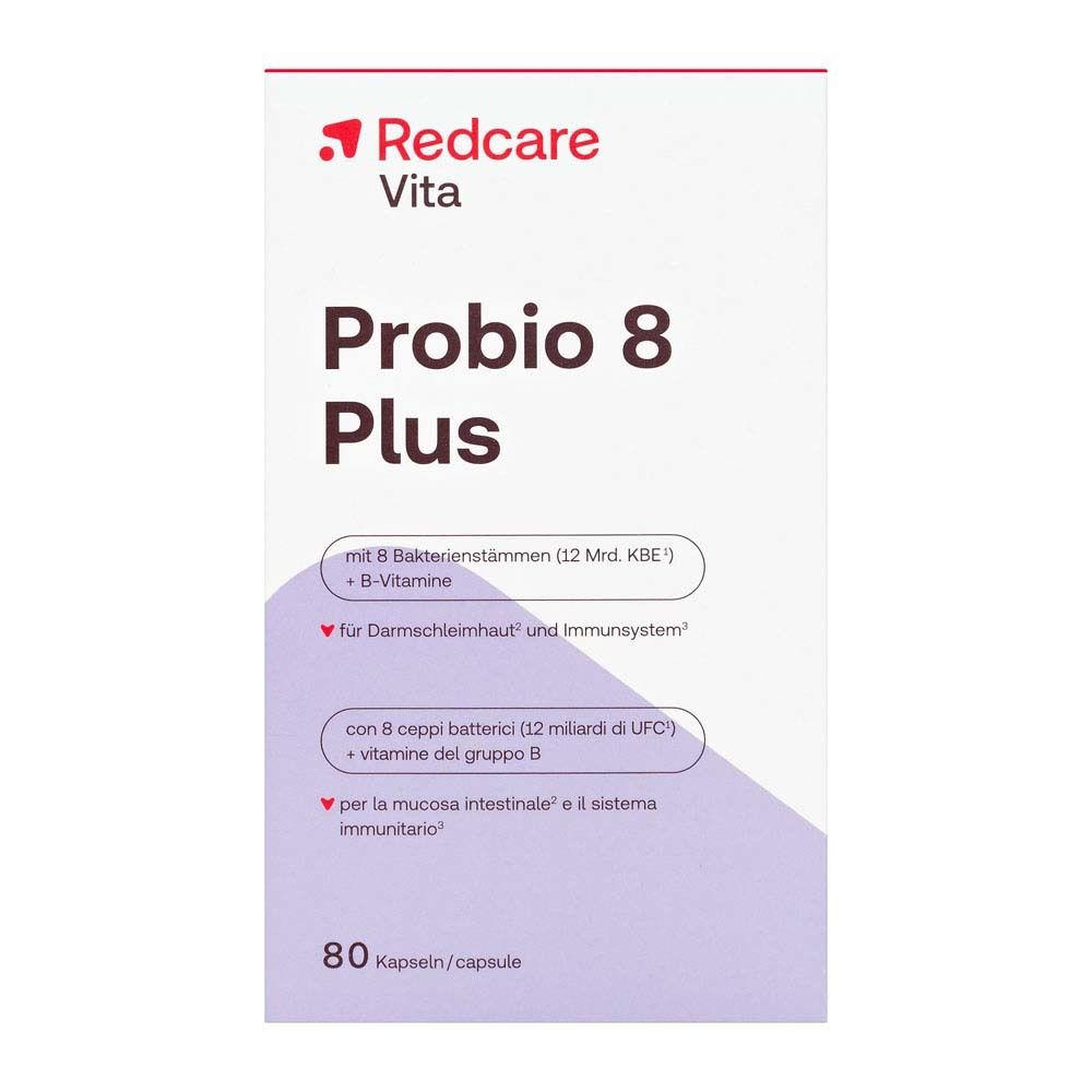Redcare Probio 8 Plus - высокодозированный пробиотик с 8 штаммами молочнокислых бактерий (более 12 миллиардов микроорганизмов) и комплексом витаминов группы B. Поддерживает здоровье пищеварительной системы, нормальную функцию иммунитета и сохранение слизистых оболочек. Упаковка содержит 80 капсул для курса приема 2-3 месяца.